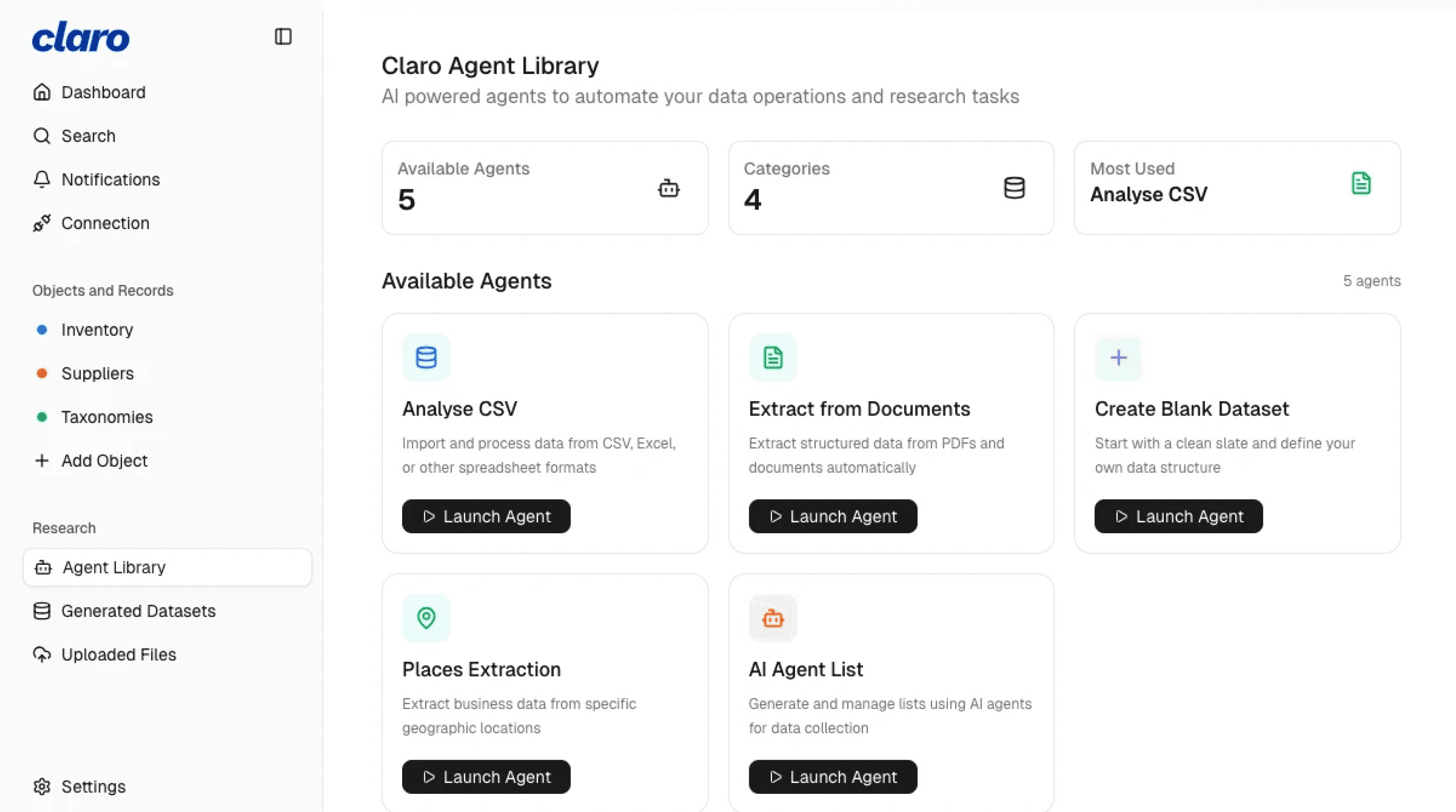 Upload supplier feeds and spec PDFs. Claro pulls data from any format, no prep needed.