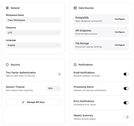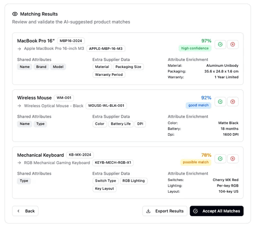 Claro helps teams ingest, clean, standardise, and maintain product and supplier data at scale. From messy spreadsheets and PDFs to multi-supplier catalogs, Claro keeps your data structured, reliable, and continuously up to date across systems.